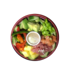 Hähnchenfleisch gegrillt, mit Paprika, Mango, Gurke, Edamame, Avocado, Röstzwiebeln, Sesam *K.